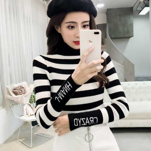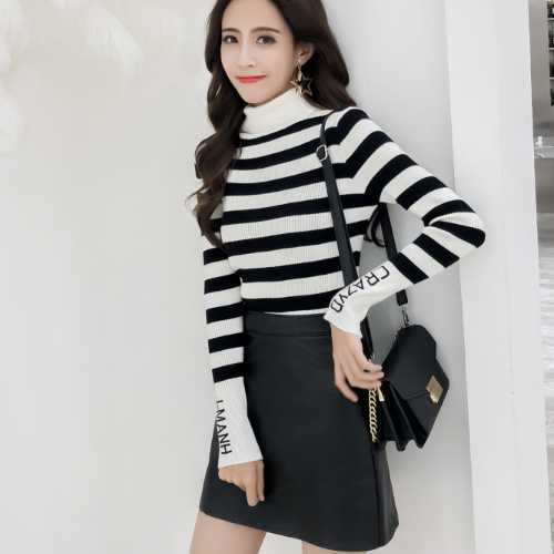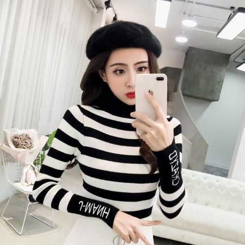 《入荷待ち》 ボーダーニット 袖文字 タートルネック ボトルネック フィット トレンド ベーシック シンプル 定番 おしゃれ カジュアル 秋 冬 レディース