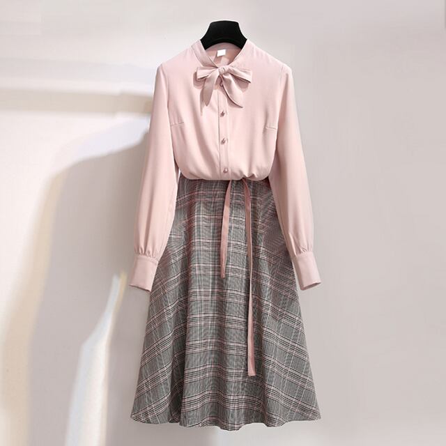 《入荷待ち》セットアップ 2ピース ブラウス リボン 長袖 シフォン ハイウエスト スカート ミモレ丈 チェック柄 ガーリー 甘辛コーデ 女子会 デート お出掛け 可愛い レディース