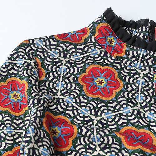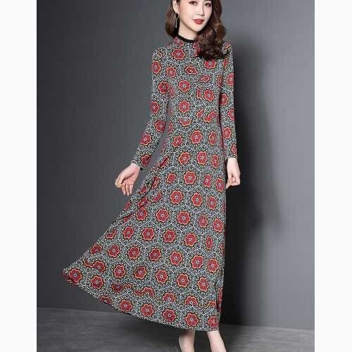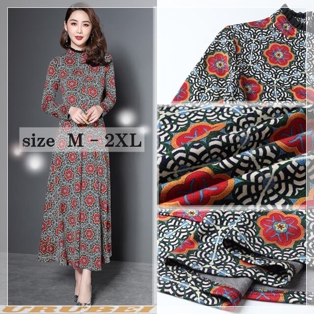 《入荷待ち》 ドレスワンピース 花柄 大きいサイズ ハイネック 長袖 フリル フレア ロング丈 エスニック レトロ 大人 かわいい デート パーティー お呼ばれ 謝恩会 秋 レディース