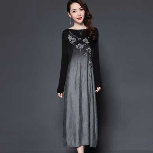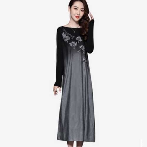 《入荷待ち》ニットドレス グラデーション 全2色 ボートネック ロングスカート ミドル丈 ロング丈 長袖 刺繍 フラワー ローズ スパンコール 大人 セレブ 上品 パーティー 秋 レディース
