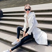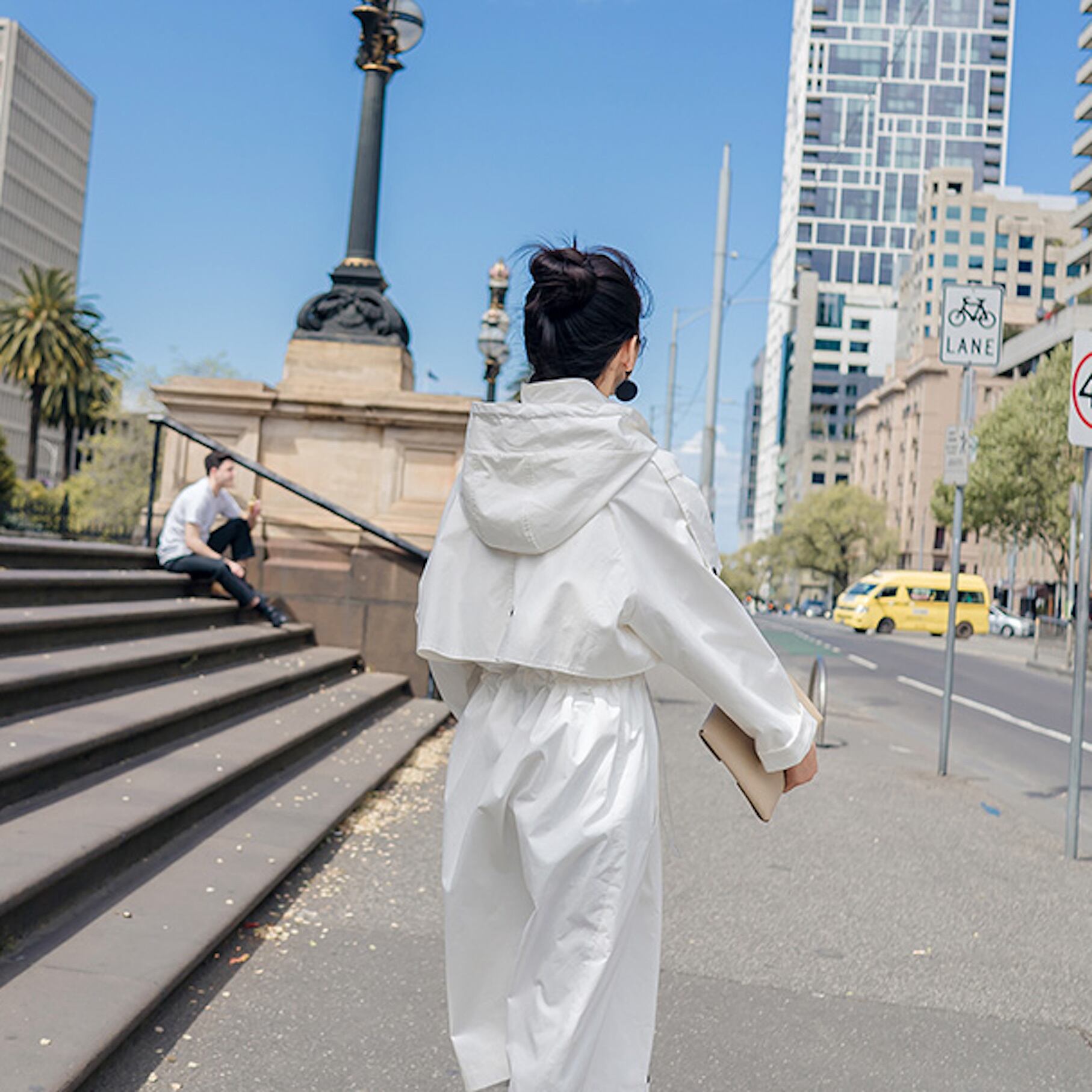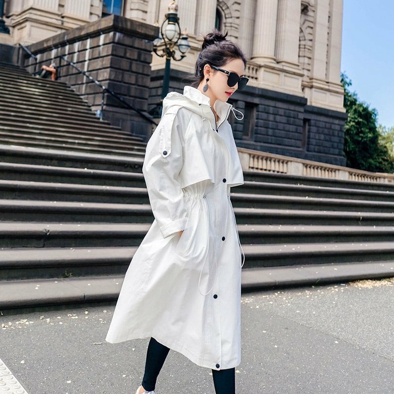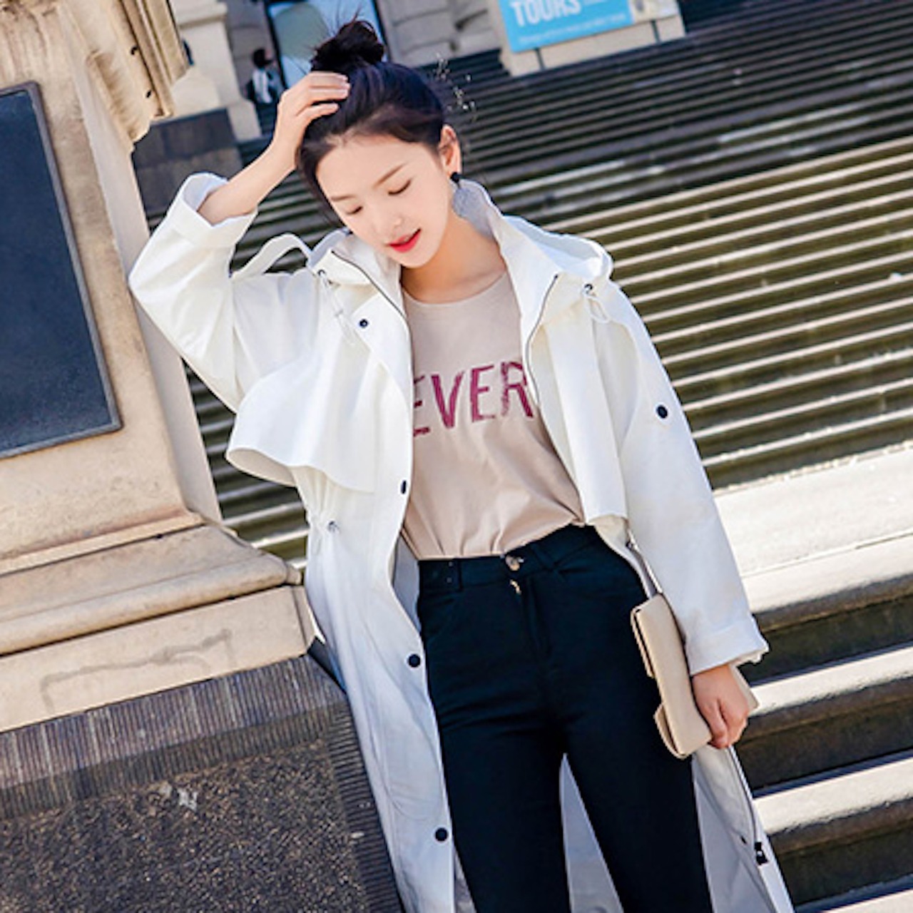《入荷待ち》ホワイト ロングコート ジッパー フーディー フード付き 膝丈コート ウエストマーク ハイウエスト Aラインシルエット ハイネック オフホワイト トレンド