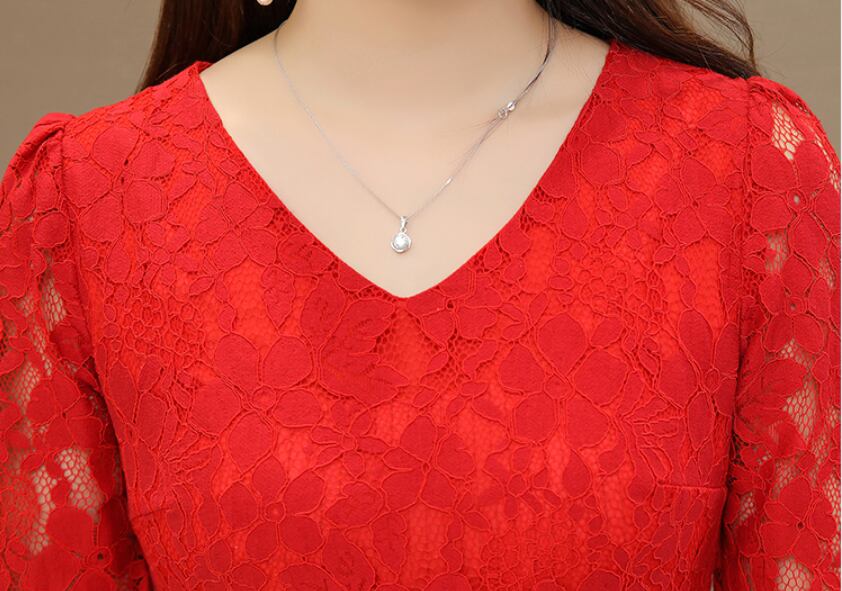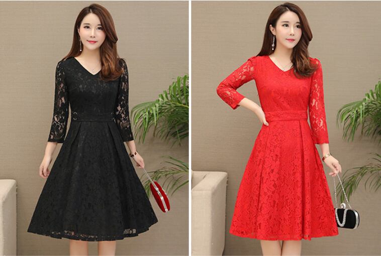 《入荷待ち》大きいサイズ 全2色 ドレスワンピース 膝丈 総レース 切り替え ウエストベルト フレア シースルー Vネック お呼ばれ パーティー エレガント レディース
