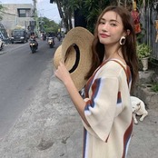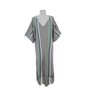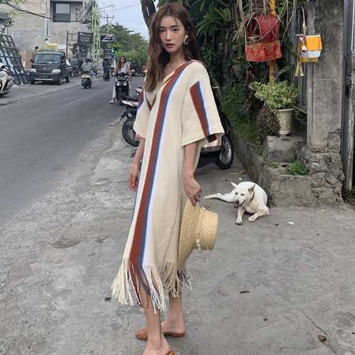 《入荷待ち》タッセル ワンピース Vネック レトロ コントラスト カラー ロング丈 ミディ丈 五分袖 ストレート ラフ ルーズウエスト シック お出かけ レディース