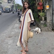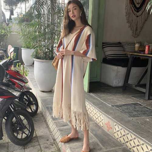 裾のタッセルが歩くたびに揺れるおしゃれなレトロ調ワンピース!