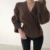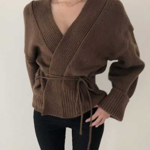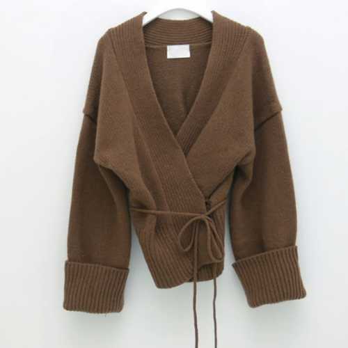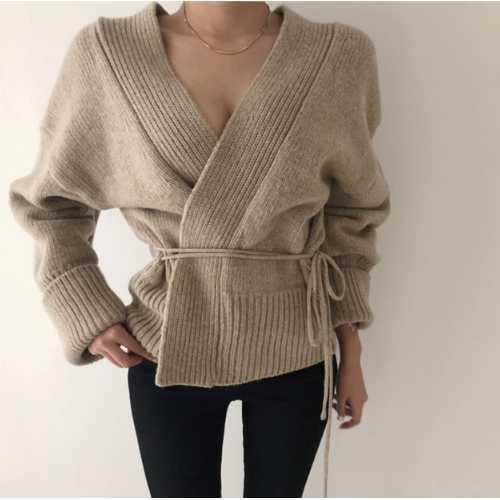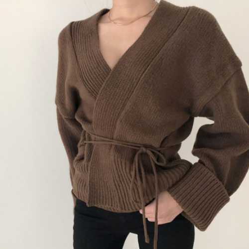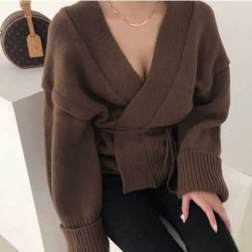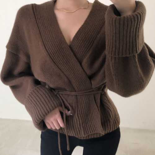 《入荷待ち》Vネック カーディガン ニット セーター リブ ウエスト リボン 深V 秋カラー ラフ ルーズ 2019 秋 冬 あったか 大人 セクシー デート シック シンプル ベーシック レトロ レディース