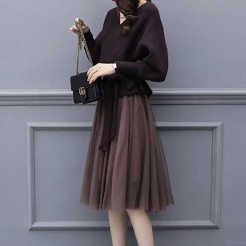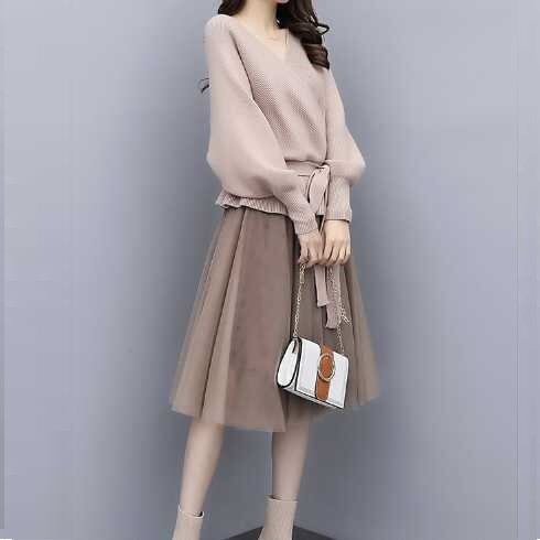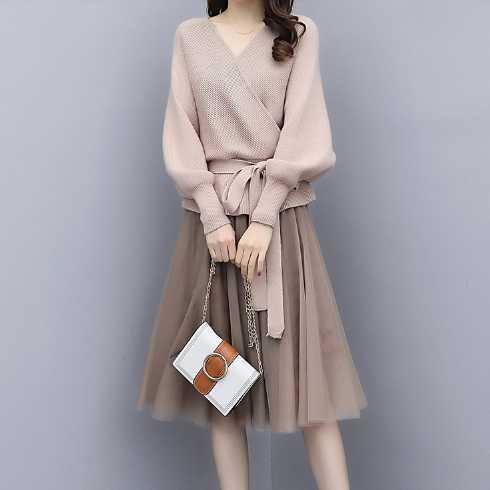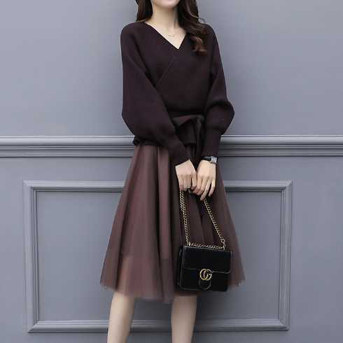 《入荷待ち》大きいサイズ 全2色 ツーピース リブ ニット ドレスワンピース ウエストリボン シフォン スカート Vネック 長袖 膝丈 ミディ丈 大人 セクシー お呼ばれ デート パーティー 秋 レディース