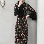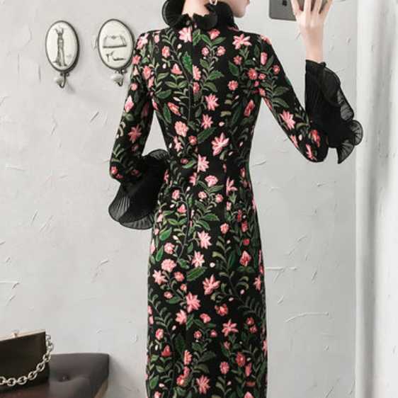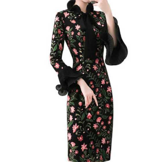 《再入荷》 花柄 ドレスワンピース ハイネック 袖フリル タイト 膝丈 ミニ丈 長袖 フラワー ブラック セクシー スタイリッシュ ストレート リボン 大人 エレガント デート パーティー 秋 レディース