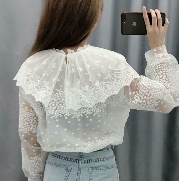 《入荷待ち》小さいサイズ ブラウス トップス レース フリル ドット柄 刺繍 フェミニン 可愛い ゆるふわ お洒落 清楚 ホワイト 可愛い レディース