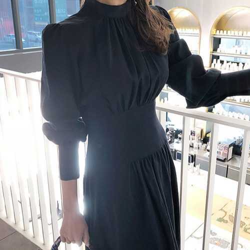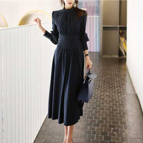 ワンピース ドレス ハイネック ハイウエスト 長袖 膝下丈 ミディ丈 ネイビー お呼ばれ 上品 大人可愛い 無地 シンプル フレア 秋 レディース