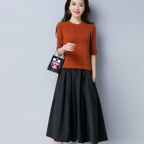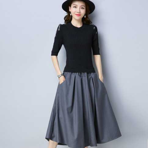 ニット ワンピース 膝下丈 切り替え 2ピース風 OL フレア 長袖 五分袖 大人可愛い デート フェミニン 通勤 お呼ばれ オフィス 秋 冬 レディース