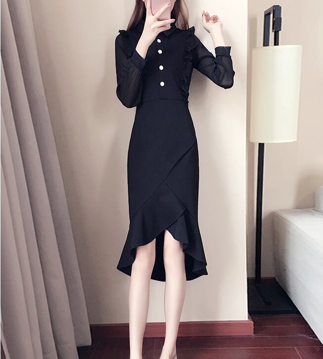 《入荷待ち》ワンピース ブラック スリット ミディ丈 アシンメトリー 襟付き フロントボタン フレア パーティ お出掛け お洒落 レディース