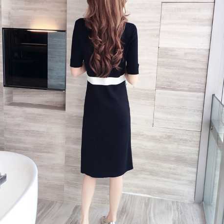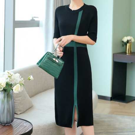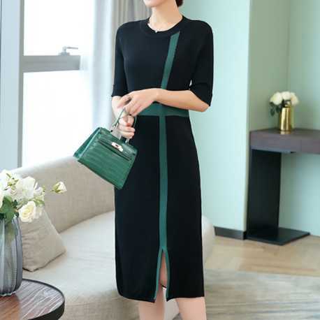 《入荷待ち》大きいサイズ 全2色 ニットワンピ ワンピース ニット 五分袖 タイト ハイネック カラーライン ハイウエスト クルーネック スタイリッシュ 秋 冬 デート 女子会 お呼ばれ 膝下丈 スリット レディース