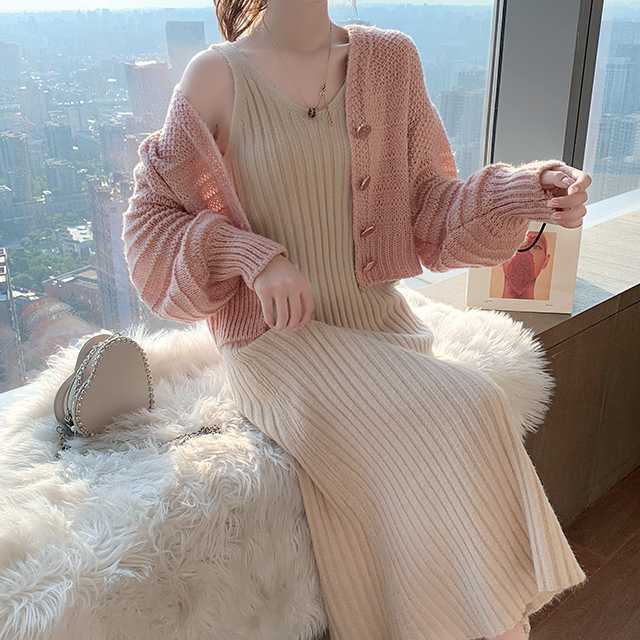 《入荷待ち》 セットアップ ツーピース 2点セット カーディガン ゆったり ガーリー 長袖 ロングワンピース リブニット ノースリーブ 春 秋 お呼ばれ ガーリー デート 上品 キュート 大人可愛い