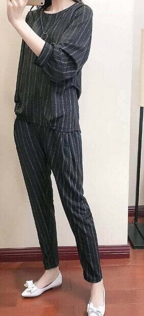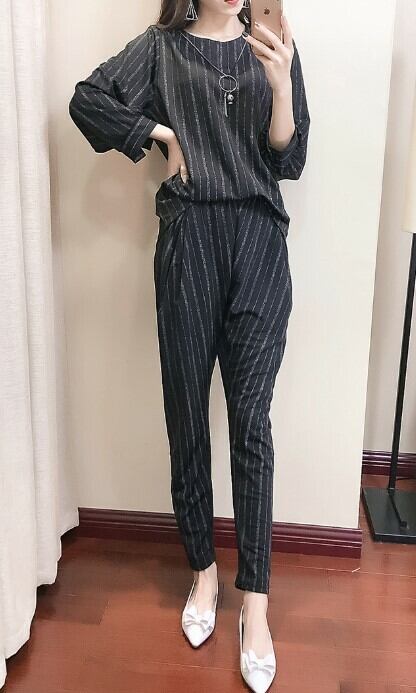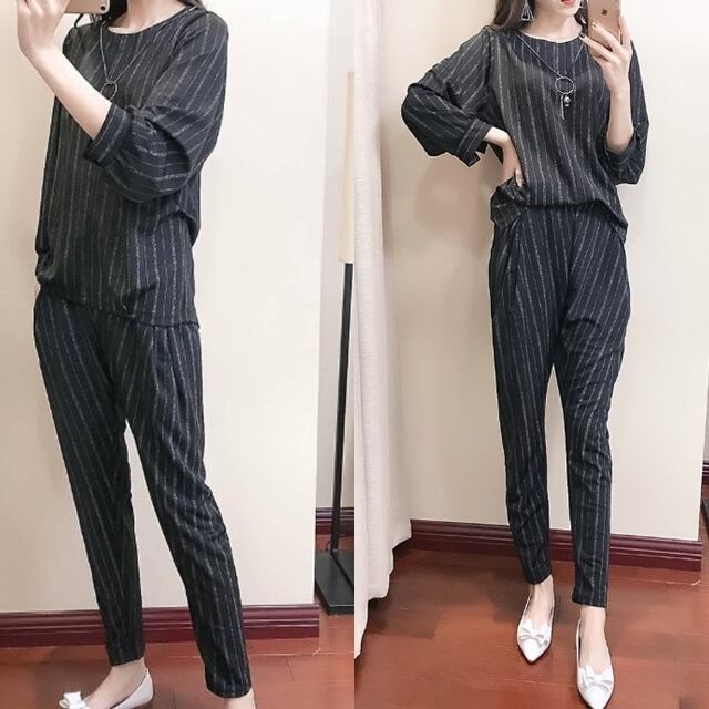 《入荷待ち》 大きいサイズ セットアップ ツーピース トップス 長袖 ラウンドネック ストライプ カジュアルパンツドレス クロップドパンツ
