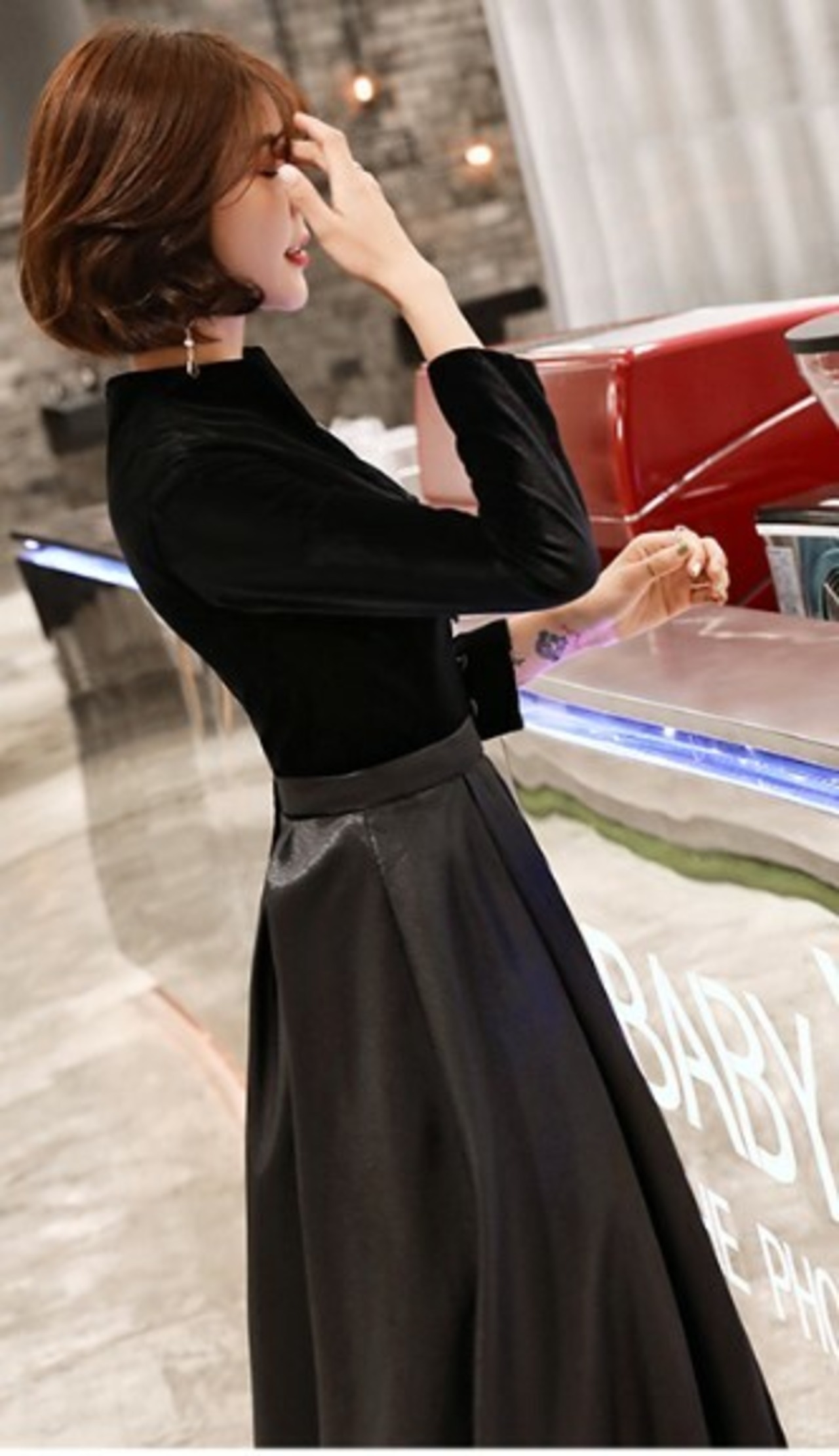 ベロア素材とフェイクレザーを組み合わせたら、大人女子にぴったりのレディライクな1枚に仕上がりました。