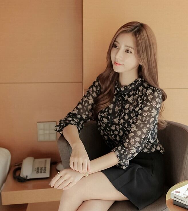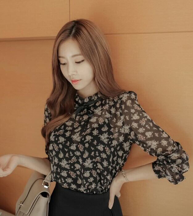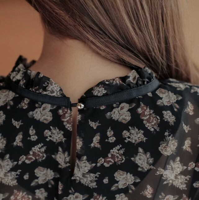 《入荷待ち》シフォンブラウス シャツ トップス レディース 総柄 ノーカラー ハイネック リボンタイ 花柄 透け感 フラワー 総柄 五分丈 七分丈 華やか ガーリー 大人可愛い 春 秋 冬 オフィスカジュアル デート 女子会 合コン 20代 30代