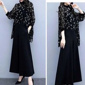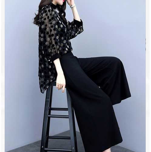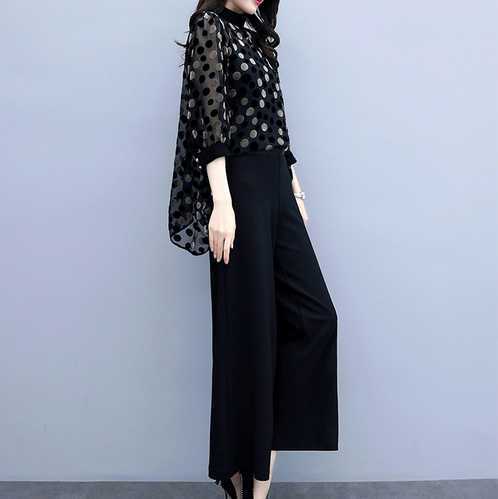 大きさ違いの&ランダム配置のドットでフェミニンに!ワイドパンツで大人かっこよく!