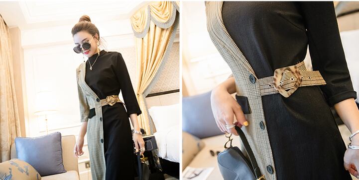 《入荷待ち》 ワンピース パーティードレス バイカラ― ウエストベルト チェック柄 ベージュ×ブラック ニット ハイネック エレガント スカート 大人 お呼ばれ パーティー レディース