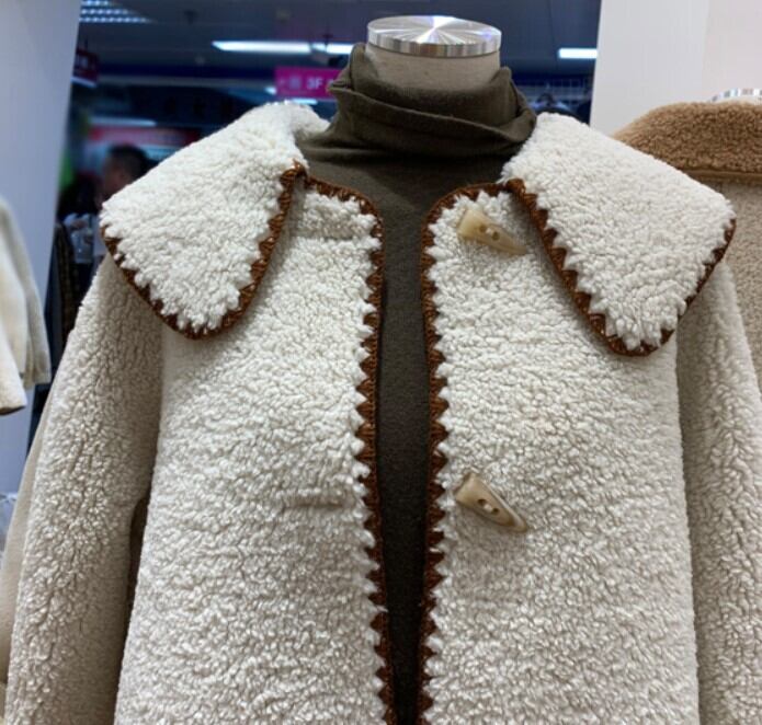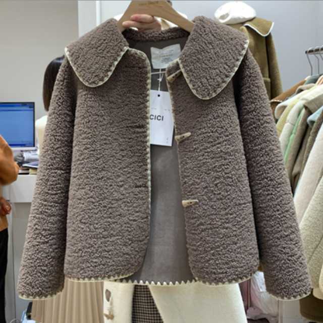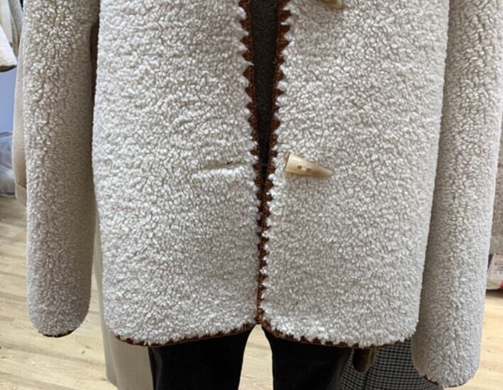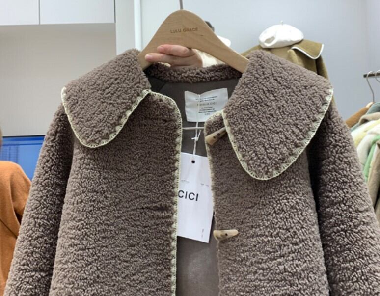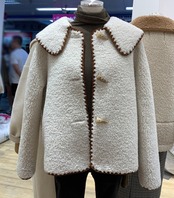 大きめの襟と毛糸でざっくり縫ったようなデザインがポイントのアウターは