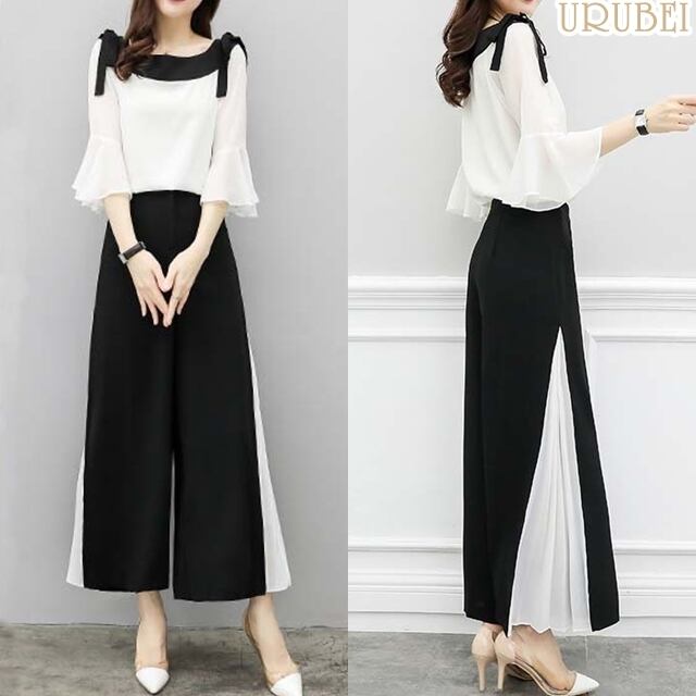 ホワイトとブラックの可愛さもあり、クールさもあるワイドパンツとシフォンブラウスのツーピースです♪