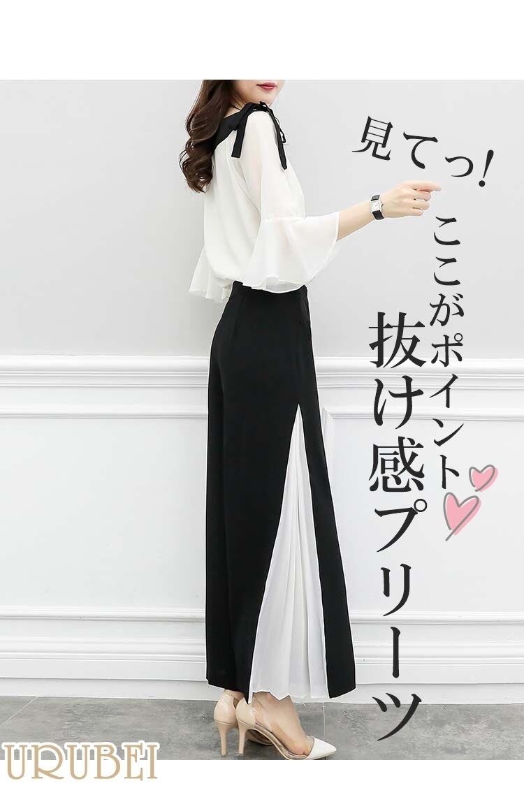 即納 数量限定 在庫あるだけ セール 超特価 ワイドパンツ ボートネック トップス パンツ ホワイト ブラック リボン シフォン ツーピース セットアップ 大人可愛い スタイリッシュ フェミニン キュート フリル袖 五分袖 大きいサイズ レディース