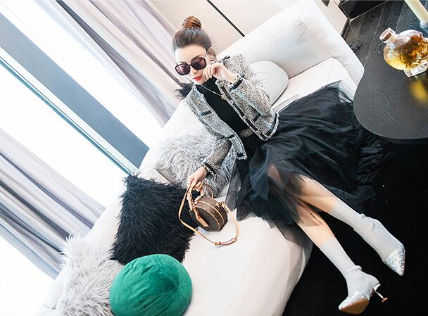 《入荷待ち》お呼ばれ セットアップ 2ピース ノーカラ―ジャケット チェック柄 チュールスカート シフォン アシンメトリー ミディ丈 高級 セレブ ブラック 可愛い パーティードレス お出掛け デート レディース