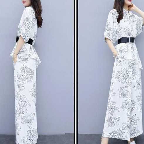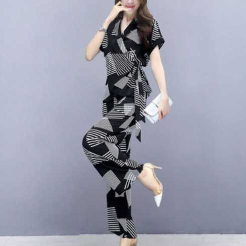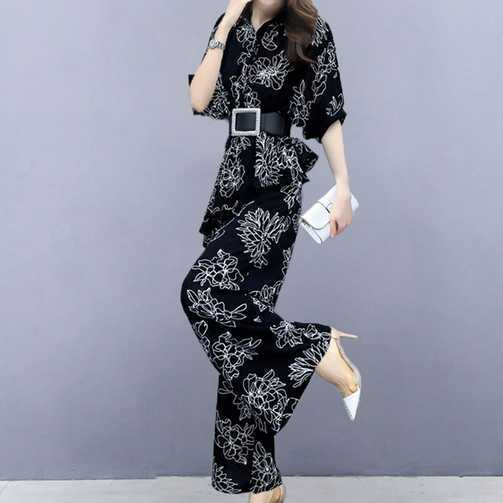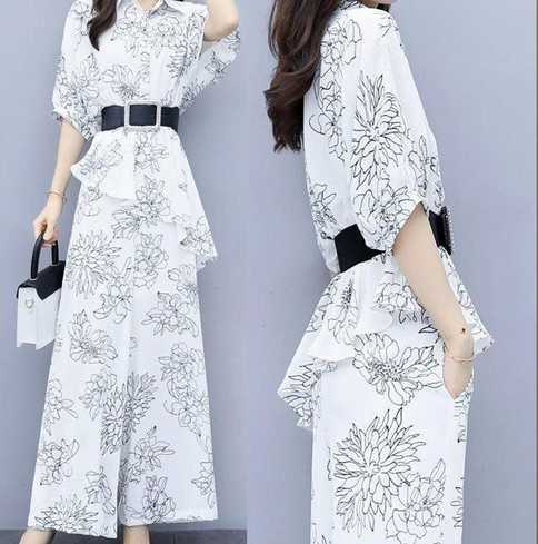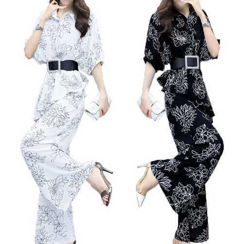 《再入荷》ツーピース セットアップ お呼ばれ ベルト付き シャツ トップス アシンメトリー ゆるかわ 柄 五分袖 ワイドパンツ フラワー プリント ストライプ ボーダー 大人 スタイリッシュ モダン 春 秋 レディース