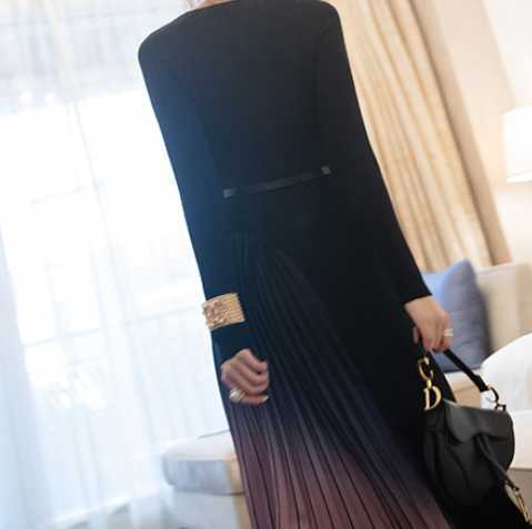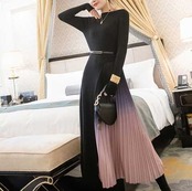 《入荷待ち》 お呼ばれ リブニット ワンピース プリーツスカート グラデーション コントラスト パープル ブラック ベルト付き 上品 エレガント ボートネック 長袖 ミディ ミドル丈 ニット トレンド 秋 冬 レディース