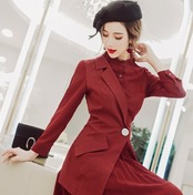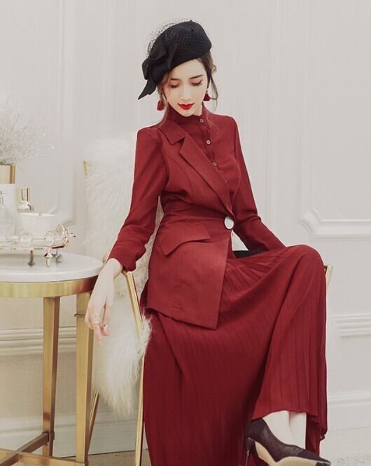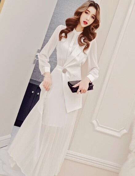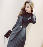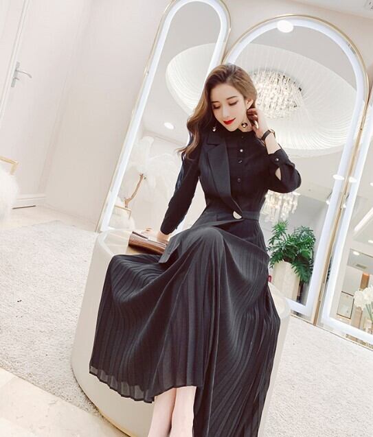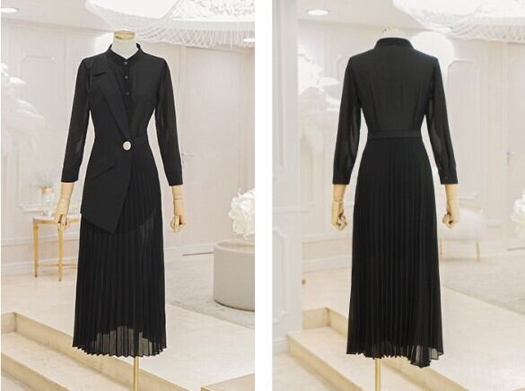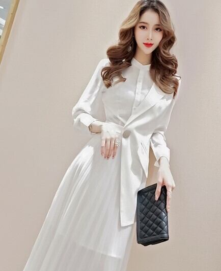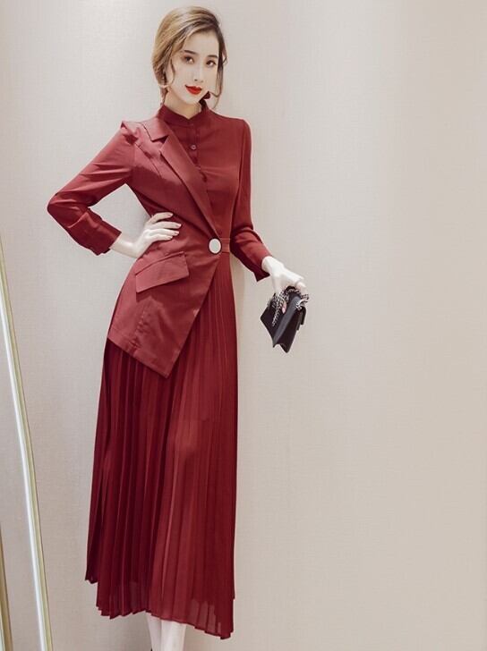 《入荷待ち》オススメ 新作 フェイクツーピース ワンピース ドレス お呼ばれ デート ディナー おしゃれ こなれ ハイネック 長袖 シャツワンピース ジャケット プリーツ 無地 シンプル アシンメトリー アシメントリー 左右非対称 春 秋 ハイウエスト ウエストマーク キレイめ カジュアル