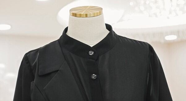 シンプルなハイネックシャツワンピに片側からジャケットを羽織ったようなデザインがオシャレなワンピースは 他とかぶらないのが◎