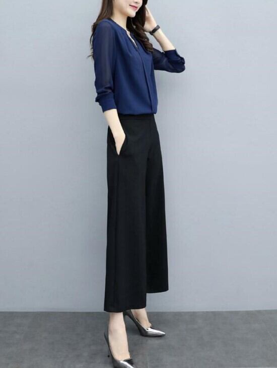 《入荷待ち》 通勤 オフィスカジュアル 大きいサイズ セットアップ ツーピース 2点セット レディース キレイめ カジュアル シフォンブラウス 透け感 長袖 七分丈 Vネック シンプル 無地 ワイドパンツ アンクルパンツ ハイウエスト 春 夏 秋 デート お呼ばれ パーティー 婚活 合コン 女子会