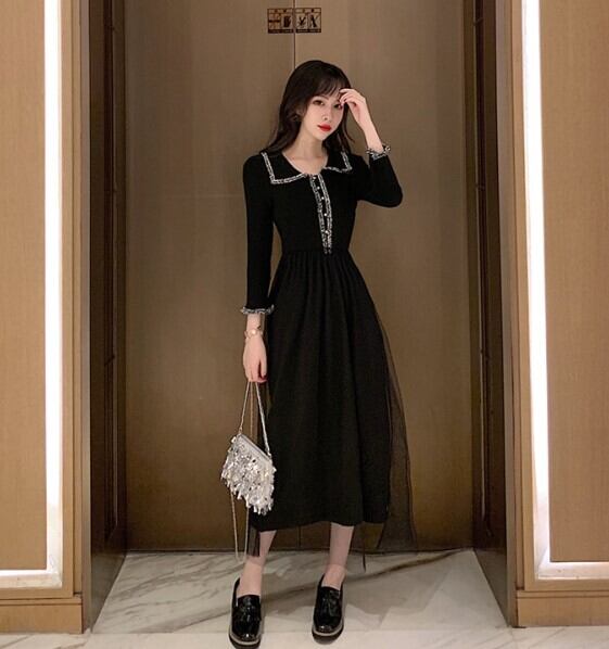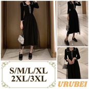 《入荷待ち》 大きいサイズ お呼ばれワンピース デート パーティー キレイめ 清楚 上品 大人可愛い 長袖 襟付き ハイウエスト切り替え チュール ロング ミディ丈 春 秋 冬 シンプル