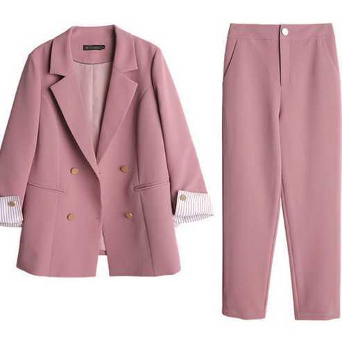 ツーピース スーツ セットアップ パンツスーツ 長袖 Vネック ストライプ袖 無地 カラー ワイドパンツ 金ボタン シック スタイリッシュ 通勤 春 秋 全3色 レディース