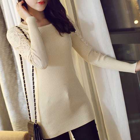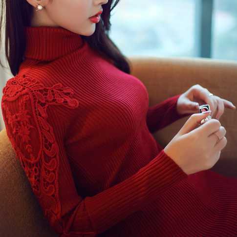リブセーター カラー 長袖 ラウンドネック クルーネック タートルネック レース 刺繍 フラワー スリム フィット セクシー スタイリッシュ フェミニン トレンド インナー ロング丈 デート お呼ばれ 秋 レディース