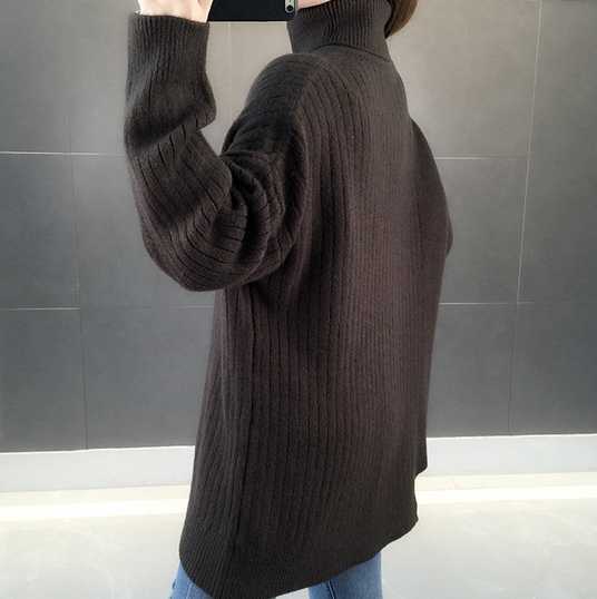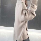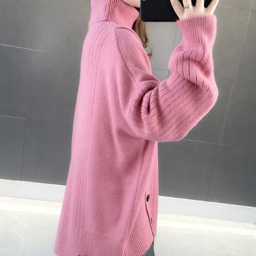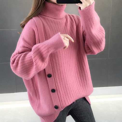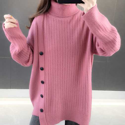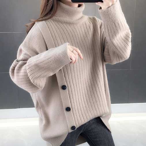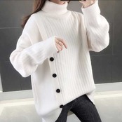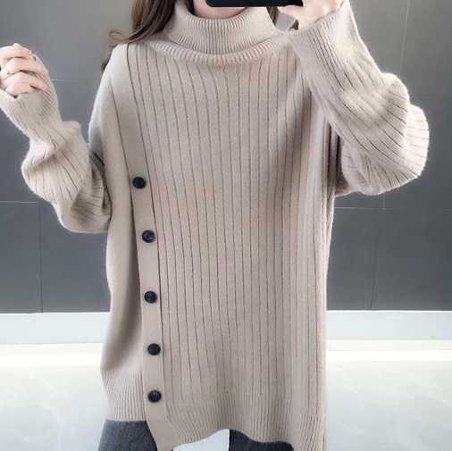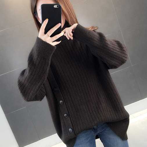 《入荷待ち》タートルネック リブ セーター プルオーバー サイドボタン 長袖 アシンメトリー 無地 スタイリッシュ ルーズ カジュアル 清楚 シンプル 秋 冬 全5色 レディース