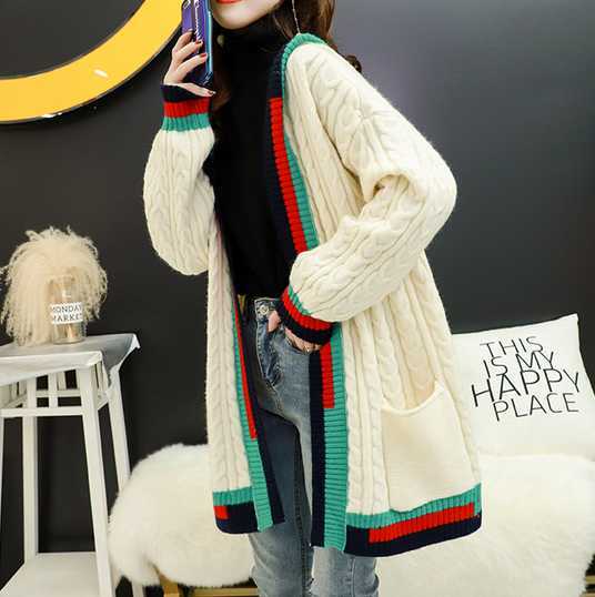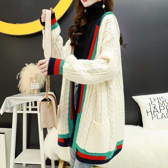 ケーブル柄と不規則に入ったカラーラインが可愛すぎるロングカーデ。