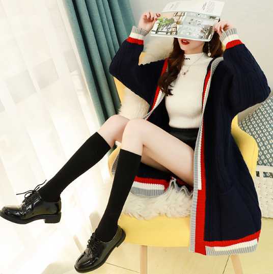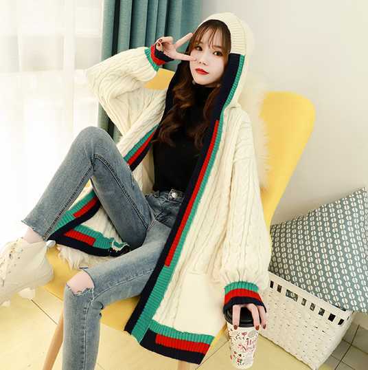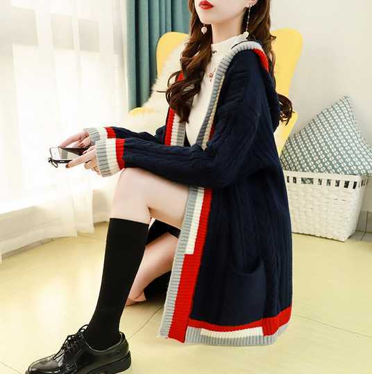 全2色 カラーライン入り フード付き ロングカーディガン ケーブル ニット ルーズ オーバーサイズ カジュアル あったか デート デイリー 秋 冬 レディース