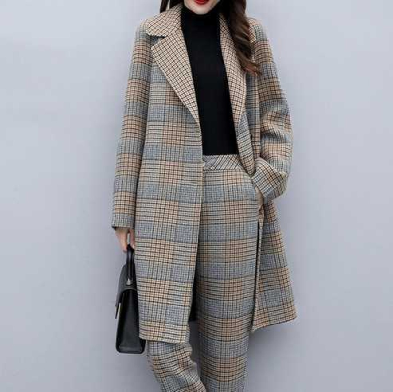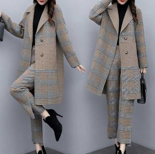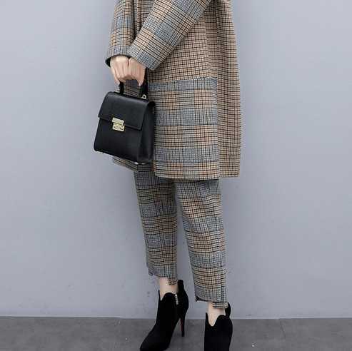 チェック柄 ツーピース スーツ セットアップ パンツスーツ ジャケット ウールコート 長袖 Vネック グレー ブルー ボタン シック スタイリッシュ 大人 かっこいい お呼ばれ パーティー イベント 秋 レディース