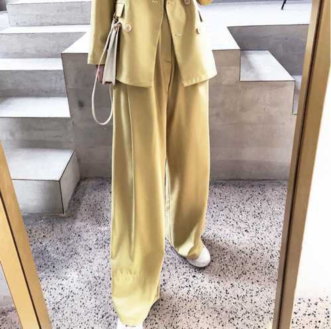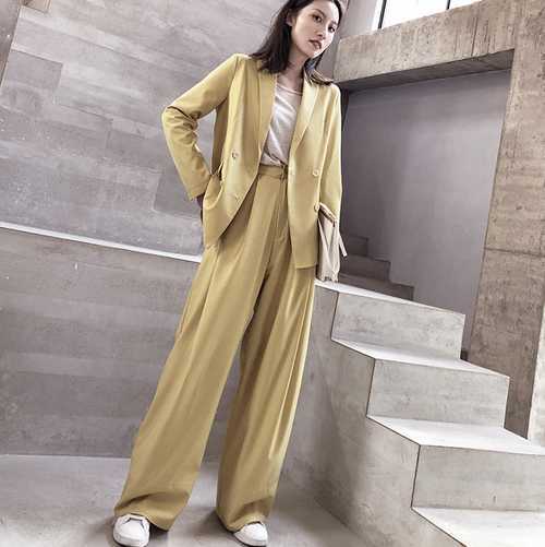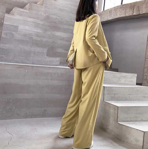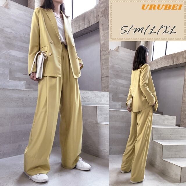 やさしいパステルイエローが綺麗なパンツスーツ。