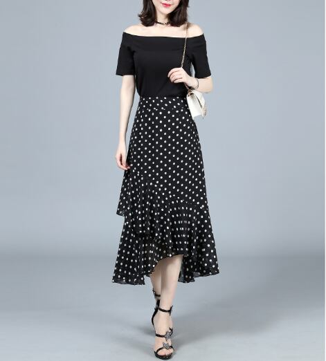 大きいサイズ レディース スカート ミディ丈 ひざ下丈 フィッシュテールスカート フリル Aライン シフォン 水玉模様 フラワー まだら模様 大人かわいい 上品 エレガント クラシカル 30代 40代 50代 デイリーコーデ お洒落 お出かけスタイル