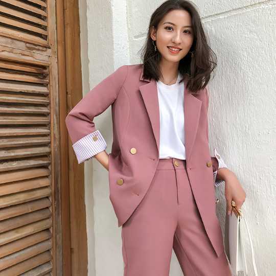 くすみカラーがトレンディなパンツスーツのセットアップ。