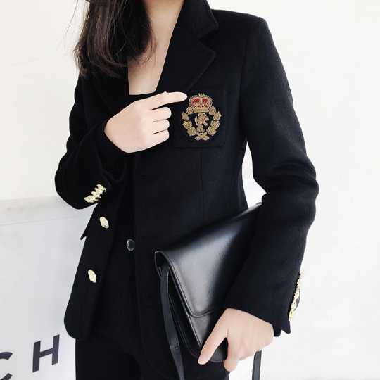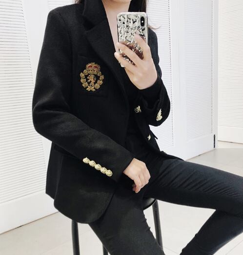 《入荷待ち》 レディース アウター スーツジャケット 羽織り 上着 エンブレムデザイン 黒 大人かっこいい お洒落 上品 クラシカル クール マニッシュ 外国人風 お呼ばれ パーティシーン セレモニー 演奏会 発表会 上20 式30 20ス