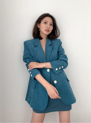 鮮やかなターコイズブルーのジャケット。
