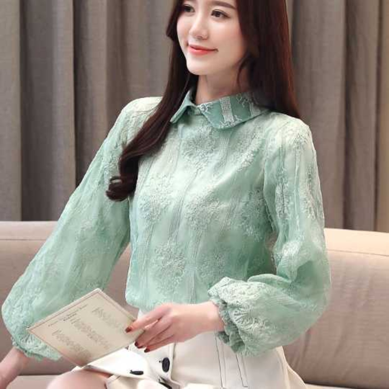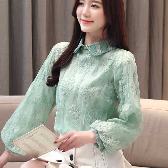 《入荷待ち》全2色 レディース トップス ブラウス レース 花柄 フラワーモチーフ グリーン 長袖 春 夏 透け感 襟付き お洒落 フェミニン 上品 きれいめ お呼ばれ デート 合コン 女子会 ママ会 演奏会 発表会 トレ定 春2020 夏2020