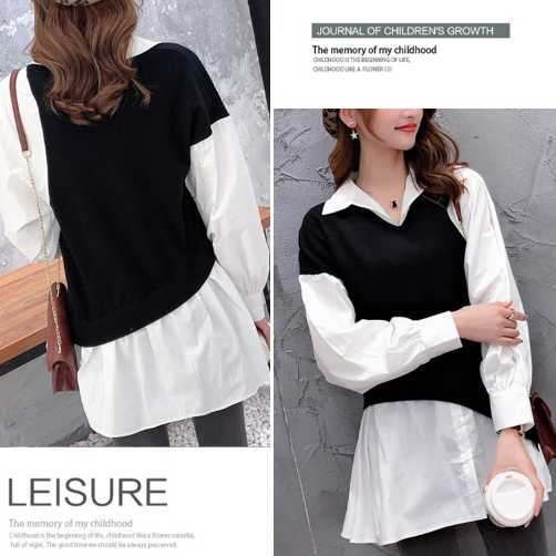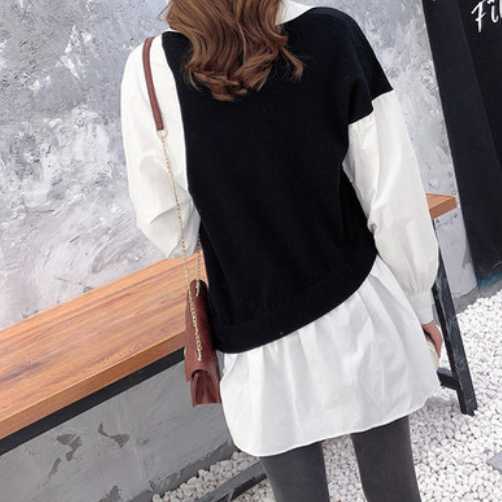 《入荷待ち》ツーピース風 セーター シャツ シンプル 無地 長袖 ロング丈 オーバーサイズ ラフ トップス スタイリッシュ 大人 かっこいい 通勤 オフィス レディース 春 春2020 30普 40普