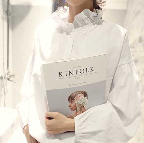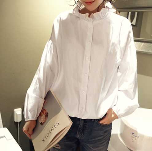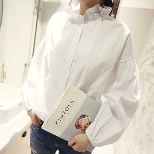 首元フリルとバルーン袖が可愛すぎる大人かわいいフェミニンなシャツブラウス。