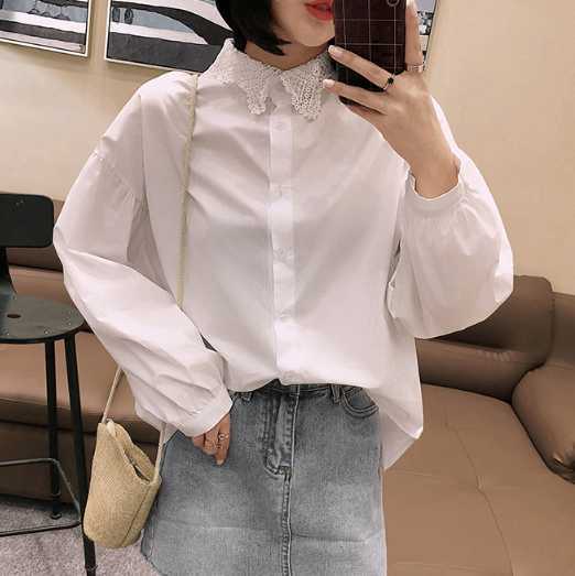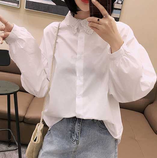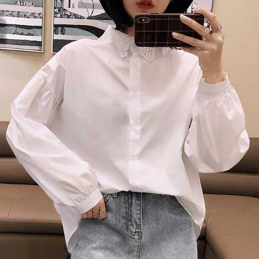 襟元のレースとバルーンスリーブが大人かわいいフェミニンなホワイトシャツ。