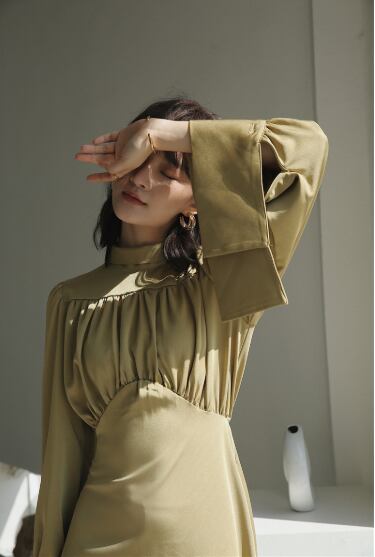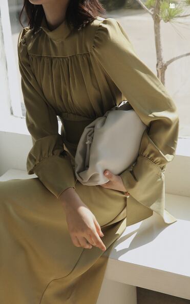 《入荷待ち》レディース ワンピース ひざ下丈 ミモレ丈 グリーン くすみカラー トレンド 長袖 春 袖コンシャス バックコンシャス ハイネック 美シルエット お洒落 上品 清楚 清潔感 ナチュラル きれいめ 大人可愛い プチプラ 結婚式 披露宴 花嫁 二次会ドレス パーティ 普段着 デイリーコーデ お出かけ デート 入学式 卒業式 式典 セレモニー 春2020 上20 30普 式30