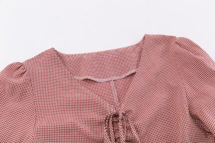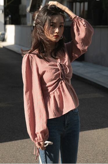 レディース トップス ブラウス チェック柄 赤 Vネック 袖コンシャス ペプラム 長袖 春 お洒落 大人かわいい ガーリー 普段着 デイリーコーデ 着回し お出かけ デート ショッピング 女子会 ランチ 飲み会 カフェ巡り 20代 30代 お花見コーデ 春2020 上20 トレ定 30普