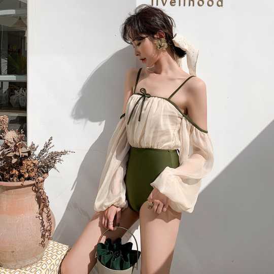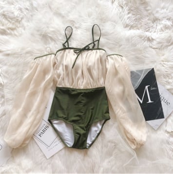 ベージュ×グリーンのバイカラーが目を惹くワンピース水着。